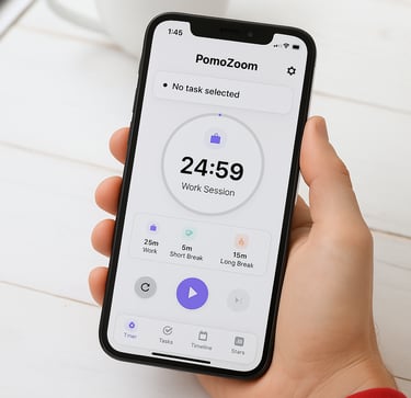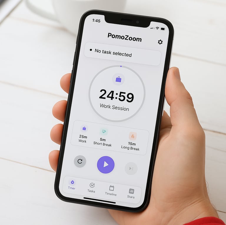 PomoZoom enhances your productivity with a Pomodoro timer, task management, timeline view, and performance statistics. Stay focused and organized while maximizing your work efficiency with our intuitive app.